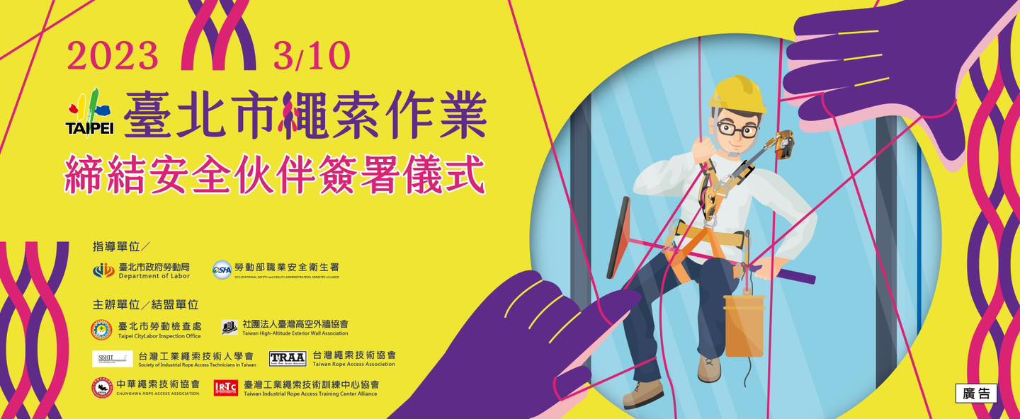 台北市勞工局勞動檢查處於3/10上午舉行「台北市勞動檢查處與繩索作業同業締結安全伙伴」活動,透過結盟及演練宣導,共同推動繩索作業職業安全衛生工作,打造安全優質勞動環境。